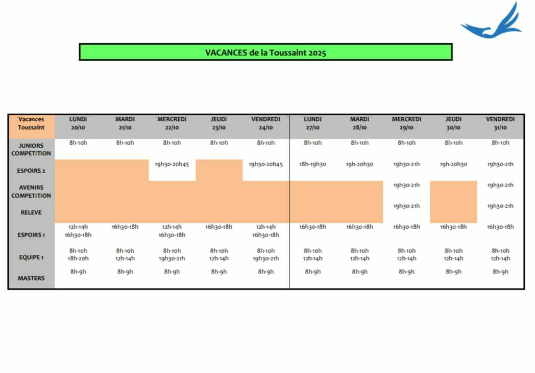Voici le planning des entrainements pendant les 2 semaines des vacances